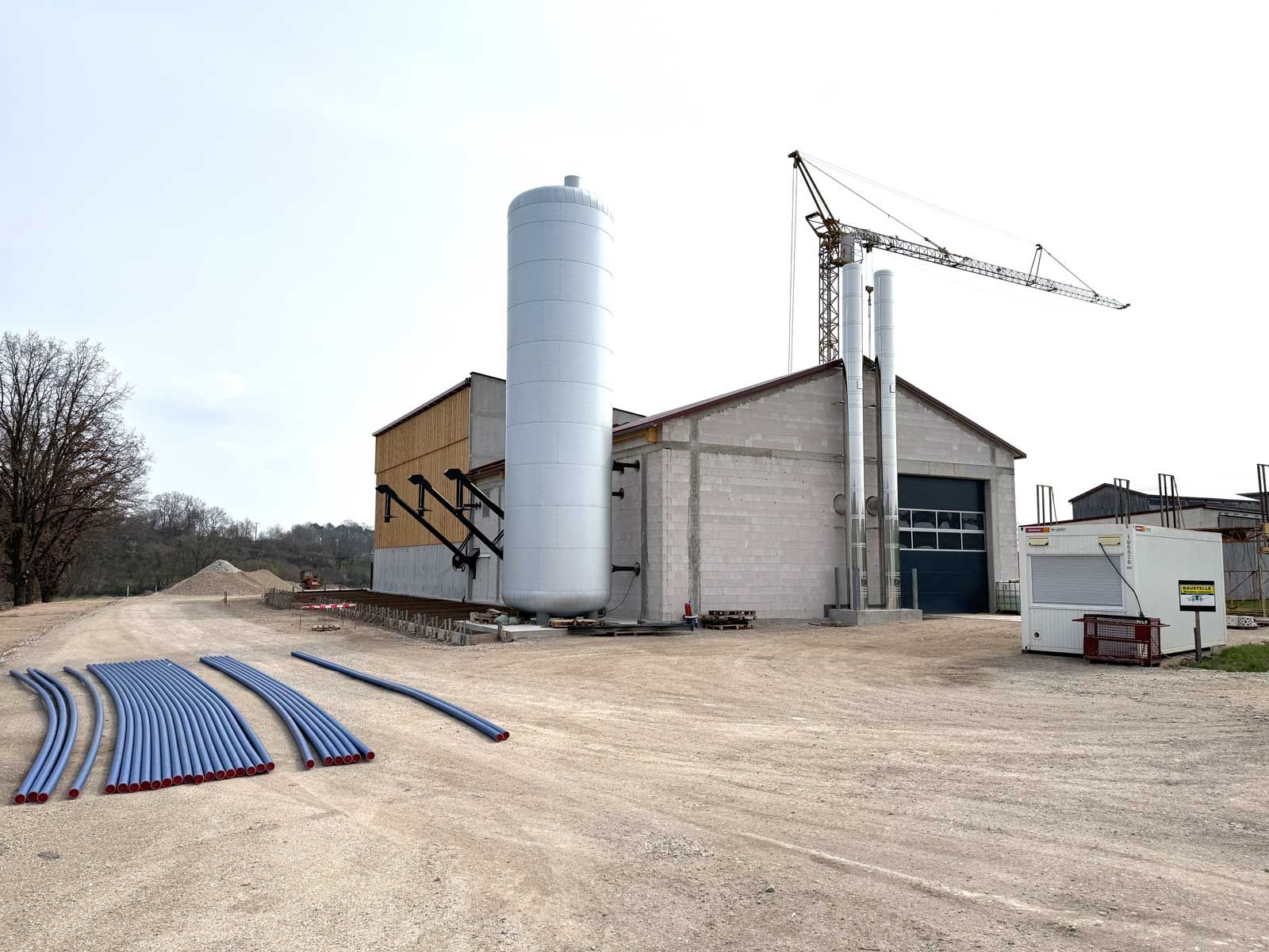 Für jeden Ersichtlich biegen die Baumaßnahmen am und im Heizhaus so langsam auf die Zielgerade ein. Der Pufferspeicher steht und auch die beiden Schornsteine sind installiert. Somit ist unser Heizhaus nun auch von außen unverkennbar. Im Inneren laufen die Installationsarbeiten an den wasserführenden Anlagen und der Verteiltechnik.