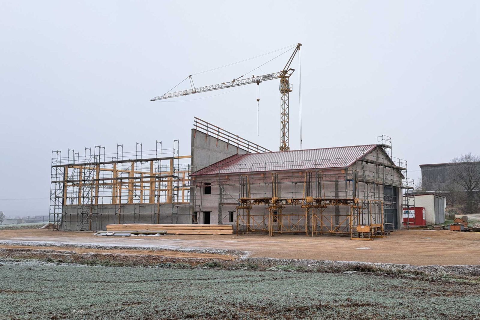 Die Rohbaumaßnahmen am Heizhaus sind weitestgehend abgeschlossen und das Dach ist drauf. Nach Weihnachten wird auch das Dach über dem Hackschnitzelbunker fertig gestellt und die Photovoltaikanlage fertig installiert.